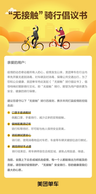美团单车发起无接触骑行倡议 建议用户必备口罩手套