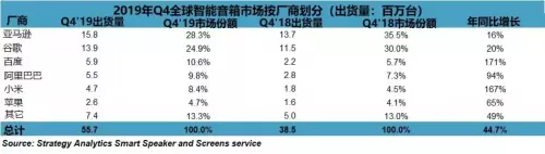 2月14日,著名市场调研公司Strategy Analytics发布了2019年Q4智能音箱出货量报告,报告指出,总体看来,亚马逊谷歌2019年市场份额较2018呈下降趋势,而中国厂商百度、阿里巴巴和小米市场份额持续增加。其中,百度旗下小度2019年Q4同比增长171%,出货量590万台,再度位列全国第一。至此,小度实现2019年国内四个季度出货量大满贯,全年出货量1900万台,成为全国年度智能音箱市场当之无愧的王者。