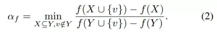 对于一个广义的集合函数 f,如定义 1 所示的子模比(submodularity)的概念可用于度量 f 所具有的子模性的程度。当 f 单调时,有这两个结论:(1)0 ≤ α_f ≤ 1;(2)α_f = 1 当且仅当 f 是子模函数。注意,在衡量 f 与子模性的相近程度方面还存在其它一些符号,比如 Krause and Cevher 2010; Das and Kempe 2011; Zhou and Spanos 2016 等中使用的符号。