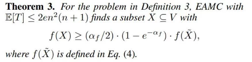 EAMC 需要知道子模比 α_f,因为替代目标 g 需要使用它。对于子模的 f,α_f = 1。对于非子模的 f,精确计算 α_f 可能需要指数级的时间,不过可以在 α_f 上使用一个下限来替代。注意,α_f 的这个下限在一些单调非子模应用中已被推导出来,比如贝叶斯实验设计和行列式函数最大化。