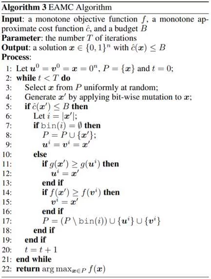 这一节介绍研究者为最大化有单调成本限制的单调函数所提出的一种简单演化算法:EAMC。EAMC 不会最大化式(3)中的 f,而是引入了一个替代目标 g,并对其进行最大化,用数学表示为: