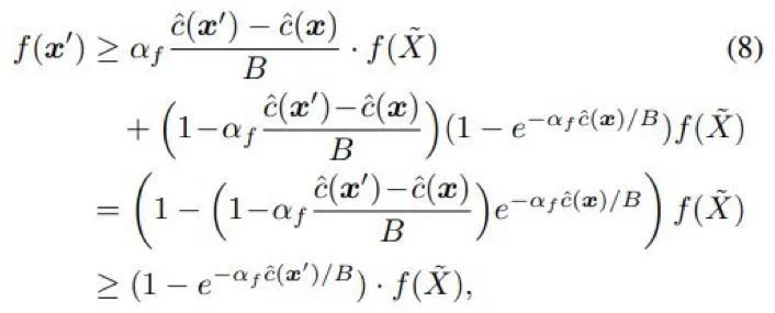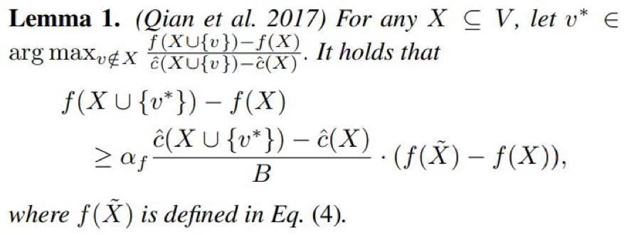 ,但预期的运行时间是多项式的上限。其证明依赖于引理 1,可以直观地看到,这意味着对于任意子集,某个特定项的包含都至少能将 f 提升一定量,这个量与离最佳结果的当前距离成比例。这里假设 v ∈ V : c () ≤ B;因为在优化前可以将任意 c () > B 的 v 直接移除。