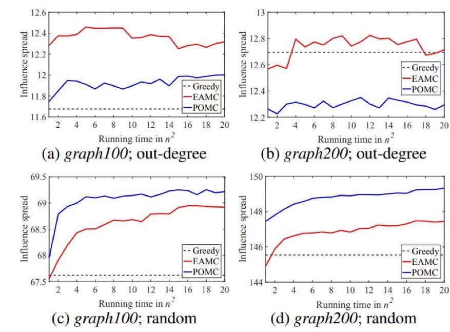图 2:有两种线性成本限制(出度和随机)的影响力最大化。影响力传播度:越大越好。