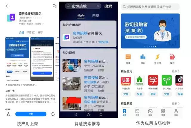 此次华为应用市场全力支持上架"密切接触者测量仪"快应用,华为快应用团队迅速抽调项目人员,成立疫情专项项目组快速分析相关开发需求。多地多团队远程协同办公,加班加点地开展快应用的开发测试工作,攻克数据查询类快应用快速开发中的技术难题,24小时内高效完成了开发和上线,并在端内对该快应用进行推荐,让华为终端用户查询疫情信息无需安装、即点即用,第一时间便捷掌握疫情权威信息。