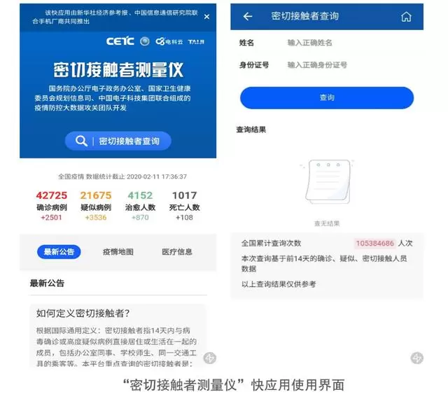 依托国家"互联网+监管"系统,新华社经济参考报社、中国信息通信研究院联合华为、小米、vivo、OPPO四大手机厂商,联合开发出新冠肺炎"密切接触者测量仪"快应用版并于11日在华为应用市场等多个平台正式上线。"密切接触者测量仪"快应用让公众可以随时随地查询自己是否是确诊、疑似病例的"密切接触者",是否与确诊、疑似病人同乘过一个航班或一列火车或一个大巴。