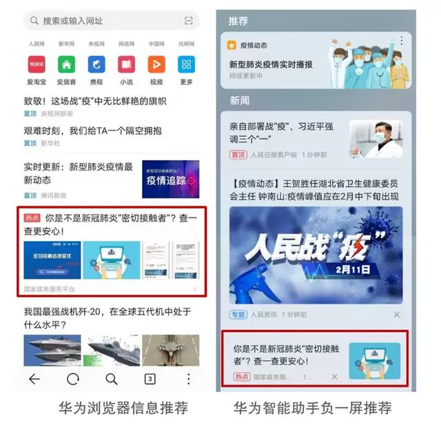 不仅如此,华为浏览器、华为智能助手也做了"密切接触者测量仪"的热点推荐,用户打开华为浏览器首页或使用华为/荣耀手机主屏右滑进入负一屏智能助手页面便可随时查询,从而快速了解疫情信息。