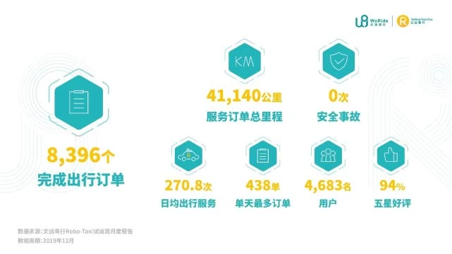 文远粤行试运营首月,即2019年12月01日至31日,共完成8,396个出行订单,零安全事故,日均出行服务270.8次,单天最多订单达到438单,服务订单总里程达4.11万公里,共服务4683名用户。