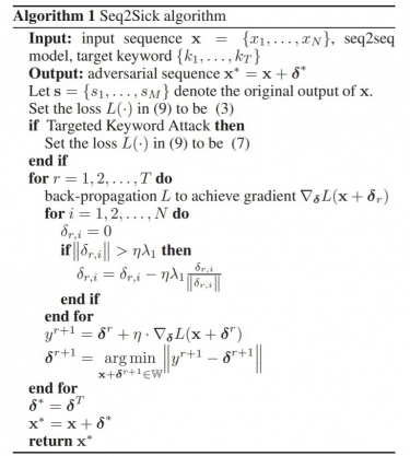 利用对抗样本攻击的难易度来评估深度神经网络的鲁棒性已成为业界常用的方法之一。然而,大多数现有的对抗攻击算法都集中在基于卷积神经网络的图像分类问题上,因为它的输入空间连续且输出空间有限,便于实现对抗样本攻击。在本文中,来自京东、加州大学洛杉矶分校和IBM研究院的研究者们探索了一个更加困难的问题,即如何攻击基于循环神经网络的序列到序列(Sequence to Sequence)模型。这一模型的输入是离散的文本字符串,而输出的可能取值则几乎是无穷的,因此难以设计对抗攻击方案,在本文之前也未被成功攻破过。为了解决离散输入空间带来的挑战,研究者们提出了结合group lasso和梯度正则化的投影梯度方法。针对近乎无限输出空间带来的问题,他们也设计了一些全新的损失函数来实现两种新的攻击方式:(1) 非重叠攻击,即保证模型被攻击后的输出语句与正常情况下的输出语句不存在任何重合,(2)目标关键词攻击,即给定任意一组关键词,保证模型被攻击后的输出语句包含这些关键词。