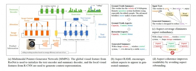 论文《Aspect-Aware Multimodal Summarization for Chinese E-Commerce Products》中提出了一个基于商品要素的多模态商品信息自动摘要系统,其可以根据商品的文本描述和商品图片自动生成商品营销短文。商品的外观决定了用户对该商品的第一印象,商品的功能属性最终决定了用户的购买行为,论文提出的多模态商品信息自动摘要系统可以有效的整合商品的外观和功能信息,自动捕捉到该商品的特色卖点,并为其生成一段简短的营销短文。不同的用户关注的商品要素往往是不同的,比如冰箱的“能耗”和”容量”,手机的“内存”和“屏幕”。系统以商品要素为切入点,挖掘商品最有卖点的商品要素,并从商品要素维度控制输出文本的信息冗余度、可读性和对输入信息的忠实度,最终生成一段简洁凝练、卖点突出、流畅、合规的商品营销短文,以期待引起潜在购买者的共鸣。