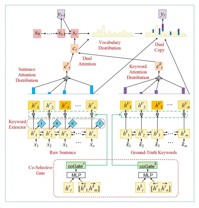 《Keywords-Guided Abstractive Sentence Summarization》论文中提出了一种文本摘要的新方法,即利用输入文本的关键词信息提高了文本摘要模型的质量。论文模拟了人类生成摘要的过程:当人类为某一段文本生成摘要时,首先会对该文本进行阅读,并识别出里面的关键词,进而通过创作加工,将这些关键词以流畅的语言表达出来。另外,文本摘要和文本关键词抽取在本质上是相通的,即都是在输入文本中提取关键信息,仅仅是输出的形式有所差异。基于上述思考,论文提出一个多任务学习框架,通过一个共享的编码器,互相强化文本摘要和关键词抽取任务。在解码器生成摘要时,利用关键词的信息和原始输入文本进行交互,通过双重注意力和双重拷贝机制,在关键词的指导下,为输入文本生成摘要。