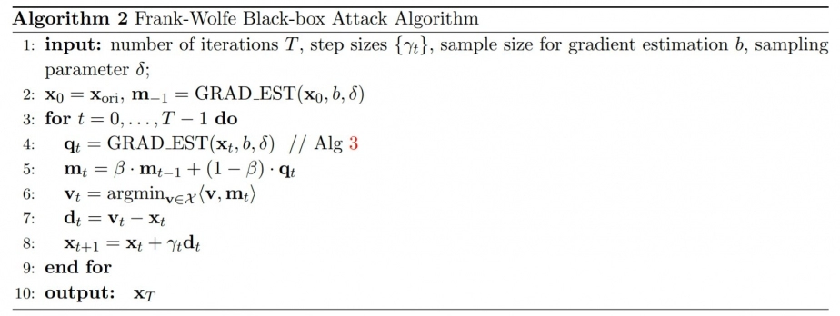 根据模型攻击者可获取的信息量来区分,对抗样本攻击可分为白盒与黑盒两种攻击形式。虽然基于优化的攻击算法如PGD等可以在白盒攻击情况下获得较高的攻击成功率,但它们生成的对抗样本往往有着较高的失真度。此外,它们相应的黑盒攻击算法通常查询效率较差,需要对被攻击的黑盒模型访问非常多次才能实现攻击,从而大幅限制了它们的实用性。针对这一问题,京东、弗吉尼亚大学和加州大学洛杉矶分校合作提出了一种基于Frank-Wolfe框架的高效对抗攻击算法,可灵活运用于白盒和黑盒对抗样本攻击。