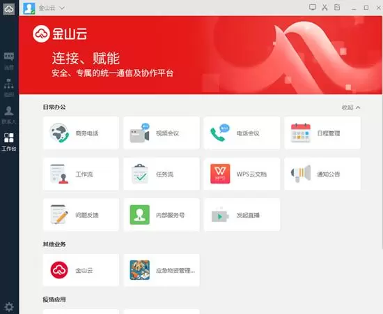 对于医疗机构的需求,金山云智通可整合医务资源实现保健管理、学术与科研、药物综合、数据云中心、核心管理、党群文化、保健站管理、办公桌等多种功能,同时协助医疗客户实现远程医疗援助、医疗设备远程链接、异地会诊、医院门户应用等。金山云智通还内嵌金山云新近开发的“应急物资管理系统”,面向各级卫健委或其他单位应急指挥部,提供对应急物资的集中入库、分配及审批,物资库存情况上报及信息提醒等一系列功能,解决医疗机构库存上报不及时、上级分配审批不及时、汇总统计工作量大等问题。