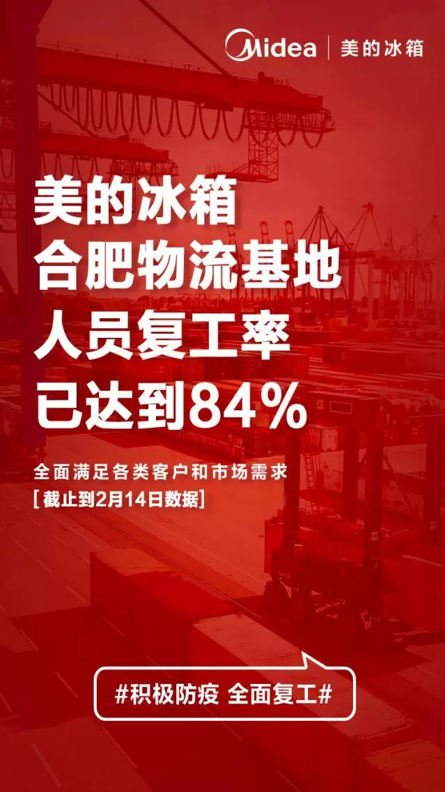 目前疫情战斗一线,已传来不少好消息,雷神山院长近日表示,全国发热数量稳健下降,疫情拐点已经到来,这极大地提振了国人的抗疫信心。2月16日,贵州全面恢复省内交通,全国即将开启全面解禁,这些对家电行业来说都是非常重要的利好消息。业内众多专家预测疫情结束或迎"报复性"增长,当前,在保障安全的情况下稳定产能,才能厚积薄发打赢疫情后的市场攻坚战。近期,美的冰箱全球六大工厂(除湖北荆州工厂外)已全面复工,各物流基地在政府严格防疫的要求下逐步提升发运量,及时满足各类市场的供货需求,以合肥物流基地为例,截止2月14日,美的冰箱合肥物流基地人员复工率已达到84%,全面满足各类客户和市场需求。