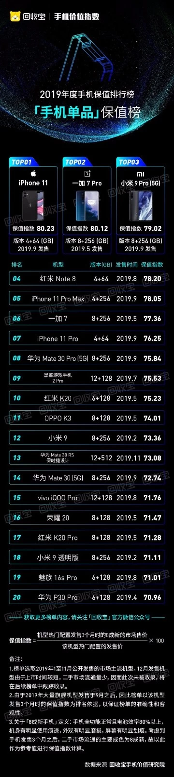 根据回收宝公布的旗舰机皇保值率排行榜的数据来看,iPhone11以80.23的保值指数,成为2019年最保值手机;一加7 Pro排名第第二,保值指数80.12;小米9 Pro (5G)紧随其后,保值指数为79.02。而华为最好的名次为华为Mate 30 Pro,排名仅第8名。