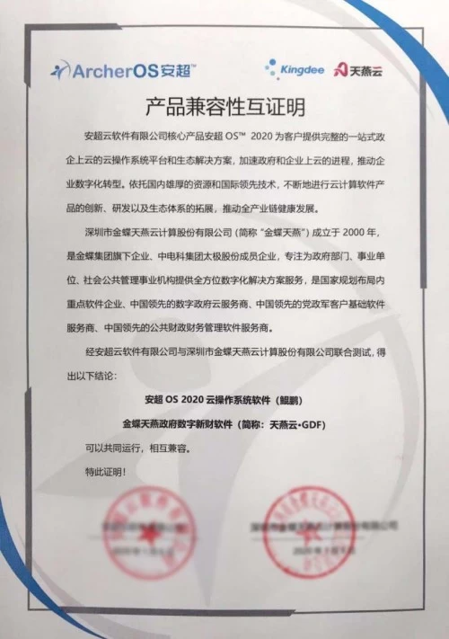 安超OS 2020与金蝶天燕政府数字新财软件完成适配后,安超OS 2020的用户可以安全、稳定、快速的使用金蝶天燕政府数字新财软件。而金蝶天燕政府数字新财软件的用户则可以通过此次双方的结合互补,获得更加丰富的一体化财务解决方案,全面促进政府财务管理水平的提高和财政经济的可持续发展。