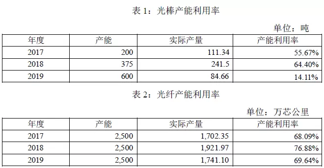 正是在这样的背景下,通鼎互联指出2019年度公司光缆的产量为1,676.01万芯公里;光纤的实际产量为1,741.10万芯公里,产能利用率为69.64%。自产光棒的实际产量为84.66吨,产能利用率为 14.11%。