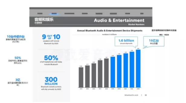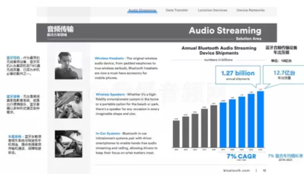 蓝牙技术联盟的权威分析,从2018年到2023年,蓝牙音频设备会以7%的复合年均增长率增长,以这种增长速度估算,到2023年蓝牙音频的年出货量将会达到12.7亿台。蓝牙耳机 – 作为最早的无线音频设备,蓝牙耳机从头戴耳机到TWS真无线耳塞,已成为手机必备的配件之一。蓝牙音箱 – 无论是高保真家庭影音系统,或是出行便携娱乐,蓝牙音箱以多种形式满足各种需求。车载系统 – 蓝牙车载信息娱乐系统与驾驶员手机相连,提供免提音频传输和通话,保障驾驶安全。