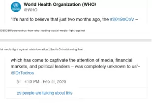 这不仅仅是社交媒体的事。世卫组织正在与世界各地传统媒体的记者和媒体机构接触,每天举行新闻发布会,确保记者获得并使用正确的信息。广播和印刷媒体有责任将公众健康置于引发恐慌的标题党头条新闻之前。