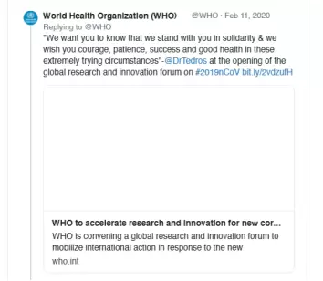 2020年2月11日,世卫组织官方Twitter发布动态称,世卫组织总干事谭德塞在全球研究与创新论坛的开幕辞中特别向中国表示支持:我们希望你们知道,我们与你们坚定地站在一起,希望你们在这种极端情况下有勇气、耐心取得成功并保持健康。此外,世卫组织正加快新冠病毒全球研发步伐。