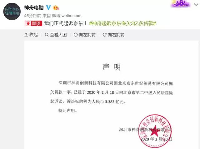 2月20日,神舟电脑在官微发布微博称,深圳市神舟创新科技有限公司因北京京东世纪贸易有限公司拖欠货款一事,已经于2020年2月18日向北京市第二中级人民法院提起诉讼,诉讼标的额为人民币3.383亿元。