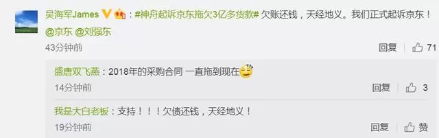 深圳市神舟电脑股份有限公司董事长吴海军在此条微博下评论,“欠账还钱,天经地义。我们正式起诉京东!”并@京东 @刘强东。
