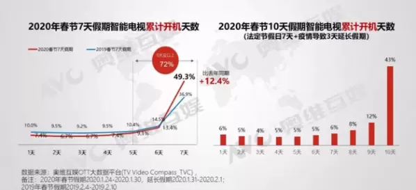 据奥维云网的数据,春节期间智能电视开机率达到45.0%,和平时相比提升了11%;对比去年春节,累积开机超过五天以上的占比超七成,累计开机10天比例的达43%。开机率明显提升以外,今年春节期间智能电视6.62小时的日均使用时长相较于去年春节的5.24个小时也大幅增长了26.3%。