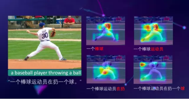 接下来,让我们通过上面的一张图片了解多模态交互技术赋予机器的深度学习能力到底有多强。如果我们用深度学习来看上图,会生成这么一句话:一个棒球运动员在扔一个球。为什么会生成这么一句话?比如,我们发现模型“看”成这个图片的时候,它实际上先是注意力集中在棒球手套这个地方,这是一个特征表明这是一个棒球运动。随后当计算机注意到跟广的区域的时候,它会提出这是个运动员。再往下,当AI模型注意到一个大腿扭曲的姿态的时候,它会认为这是一个人的动作,凭这些,计算机会认为这是一个人扔球的动作,虽然这个球的占的整面积非常小,但是因为语言模型在语义上的驱动,使得这个球也能够被识别出来,最后形成一句完整的有意义的话。这就是跨越视觉和语言两个模态,从图片到文本描述生成的过程。