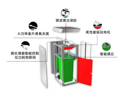 主要功能:紫外线臭氧双重实时消毒、感应开门、溢满预警、箱体倾倒预警、高温预警、清运时效性预警、投递次数统计、投递量统计、清运路线规划。