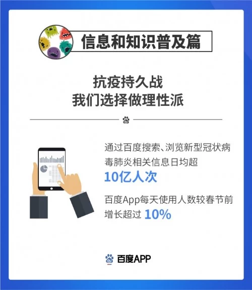 除了为用户科普肺炎相关知识,百度App也充分发挥自身技术优势,上线了患者同乘查询工具、新型肺炎智能自测工具、医用口罩生产企业一键查询工具、新型肺炎防护手册、公益小程序等多种服务,成为了广大用户科学抗疫的重要“武器”,其中新型肺炎防护手册辐射到3亿人群。