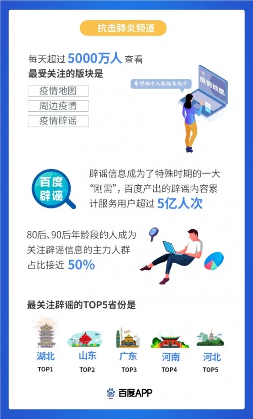 信息井喷的时代,各路消息真假难辨,为此百度也为用户构建起了一道拒绝谣言和恐慌情绪的信息壁垒。截至2月20日,百度产出的辟谣内容累计服务用户超过5亿人次。其中80、90后年龄段人群对辟谣信息尤其关注,占比近50%;湖北、山东、广东等为最关注辟谣的省份。