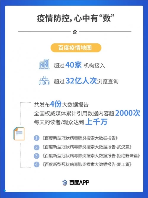 特殊时刻,大数据也成了网民做好自身防护的有力工具。在疫情地图版块,已有超过32亿人次浏览查询疫情动态。百度发布的4份新冠病毒搜索大数据报告也已被全国权威媒体累计引用超2千次,每天的读者、观众达上千万。