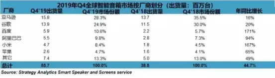 具体到各大厂商品牌,亚马逊和谷歌虽然依旧占据出货量的一二位,但各自市场份额较去年同期出现了大幅缩减,而中国品牌则持续了强劲势头,如百度、阿里、小米的市场份额依旧稳步上升,其中又以百度旗下智能音箱小度的表现最为抢眼,Q4年同比增长171%达到590万台,连续四个季度蝉联国内第一。