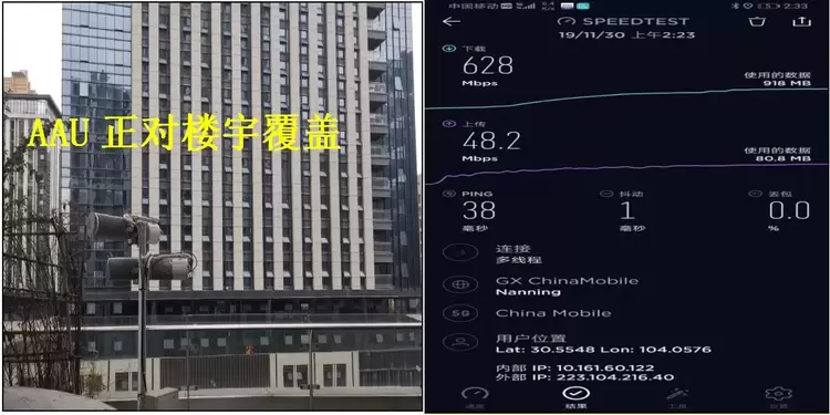 本次主要验证写字楼、道路、居民区等多个场景杆站的5G网络性能,在绿地之窗、蜀都中心、汇锦城等多个区域的4G杆站上开通40M和60M NR进行移动性、吞吐量等性能测试。现场在开通60M NR下实测5G单用户速率能够达到628Mbps。