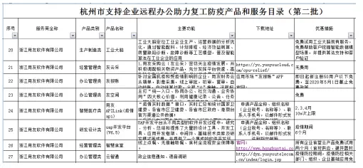 《杭州市支持企业远程办公助力复工防疫产品和服务目录》,用友近十款产品收录其中