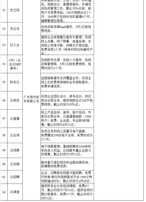 目前,用友公司已与30多个省市形成合作,如:北京、广东、浙江、山东、广西、海南、江苏、天津、湖南、江西、四川、贵州、云南、陕西、河南、黑龙江、福建、重庆、新疆、甘肃、宁夏、辽宁、吉林、安徽等 。所提供的企业云服务产品覆盖企业远程办公,人力、财务、营销、采购等业务云端管理服务,工业制造企业、医疗机构等行业数智化服务,以及云端开发运维服务等30多款云服务产品。通过数字化、智能化助力企业开展业务经营与管理,共战疫情!