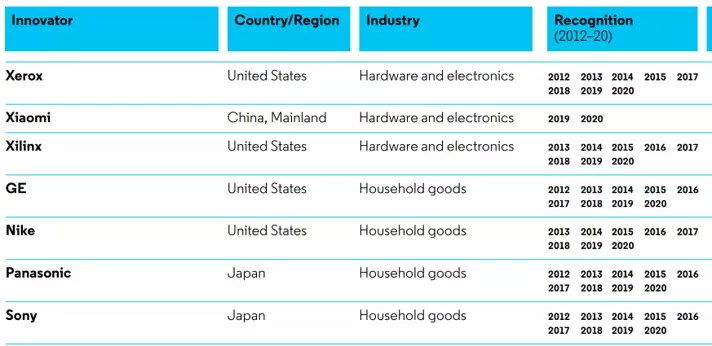 包括小米在内,今年仅有三家中国大陆企业入选该榜单,分别为小米、华为、腾讯,腾讯为今年首次上榜。三家企业,分别代表中国企业在三大专利领域的顶级成就。小米与华为、腾讯一同取得全球顶级创新水平。