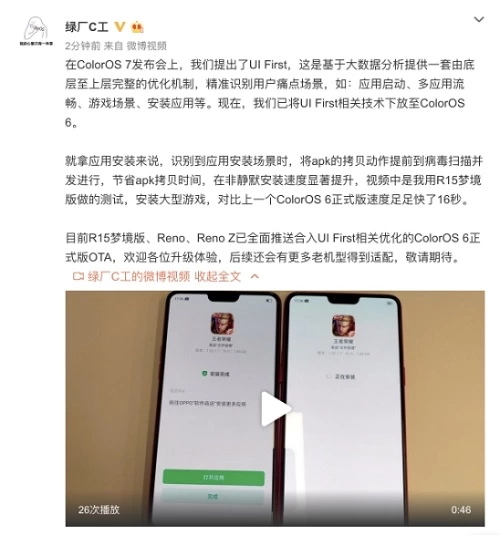 昨日,OPPO 软件工程师“绿厂C工”发布微博,表示OPPO 将 ColorOS 7 上的 UI First 技术下放到 ColorOS 6 ,让更多老用户享受到该技术带来的畅快体验。据了解,这项技术能使应用启动速度与系统资源利用效率得到提高,系统流畅度提升30%、游戏帧率更高、触控响应更快。