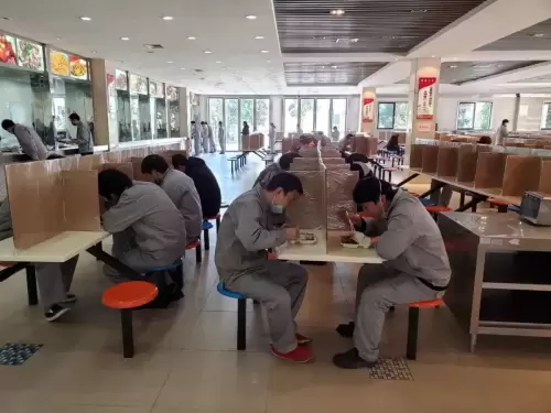 (春风动力食堂,员工在分批次、小隔间用餐)