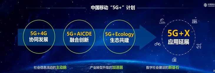 作为全球领先通信运营商,中国移动以做网络强国、数字中国、智慧社会的主力军为总体目标,全面推进“5G+”计划,顺应5G技术融合创新应用的新趋势,针对电子商务、电子政务、远程医疗、在线教育、网络娱乐等需求,释放新兴消费潜力,积极开拓更多更广的新型信息化应用场景,加速推进5G融入百业、服务大众。
