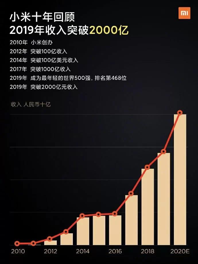 雷军回顾了小米10年的营收:2010年小米创办,2012年收入突破100亿,2017年收入突破1000亿,2019年收入突破2000亿……,在雷军看来,小米十年的商业实践充分验证了“互联网+”的强大!