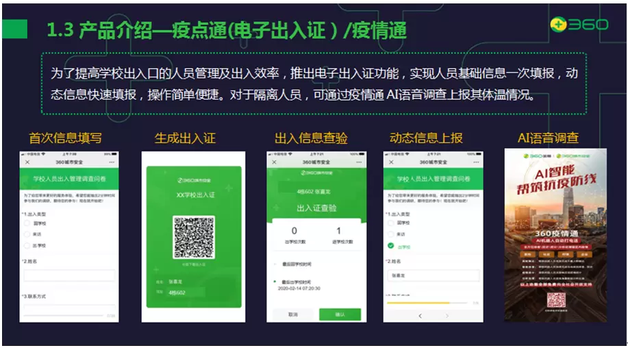 疫情期间,360疫点通(电子通行证)基于公有云以SAAS服务方式可以免费提供,结合学校已有手持式测温仪能够快速上线使用,还可以可根据学校个性化需求进行定制化软件系统开发,部署在校园网内,可与红外测温安检门进行对接,实现数据自动采集上报,满足学校防控多样化需求。此外,360自主品牌的人脸识别产品及各行业解决方案将在4月初落地,为智慧校园提供安全可靠、便捷精准的人脸识别整体解决。