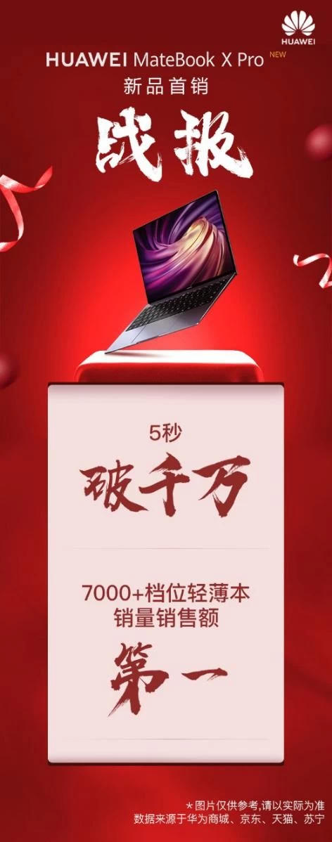 华为MateBook X Pro是针对有精致品质追求的高端商务人士和内容创作者精心打造的旗舰机型。2019款一经上市,便得到市场消费者大力追捧——2019年4月17日,2019款华为MateBook X Pro笔记本首销后仅5秒钟,京东平台销售额就突破千万元。在京东、天猫和苏宁电商平台,一举摘得7000元以上轻薄本销量和销售额双料冠军。超高的颜值与金属质感、高达91%的全面屏与独一无二的智慧体验都为消费者带来无与伦比的极致感受。