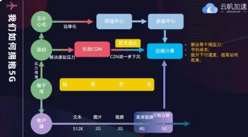 5G解决端到基站的速度,云帆边缘计算CDN将解决基站到CP方的速度,从中心云,集中化部署到边缘化,街道化,家庭化,节点数将从原来的300个IDC机房,到300个IDC机房+百万,千万个小节点。