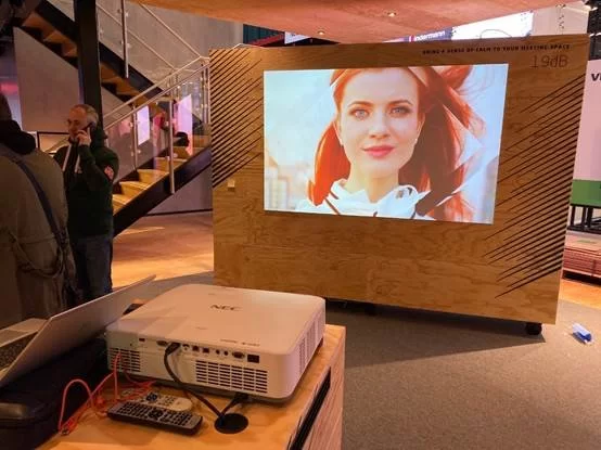 展会现场,NEC“空•灵”系列激光投影机,采用顶级降噪专利技术静音设计——ECO运行模式下19dB极限静音,为教学、商务会议用户带来安静、舒适的静音环境。