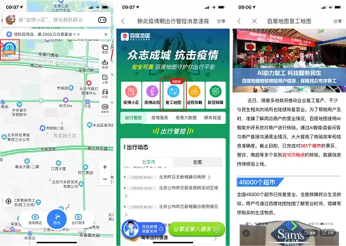 用户通过百度地图首页上方的“疫情动态”图标,进入“肺炎疫情期出行管控消息速报”聚合页面后,点击“复工地图”即可进入查看。据“复工地图”显示,目前全国45000余个超市、7500余家商场已恢复营业,全面保障民众生活供给。用户点击查看周边超市、商场等,即可结合自身所在位置,快速了解周边哪些商户已恢复营业。点击某一商户后,地点详情页中还将显示其目前的临时营业时间、联系电话,并提示用户电话确认后前往,避免跑空。