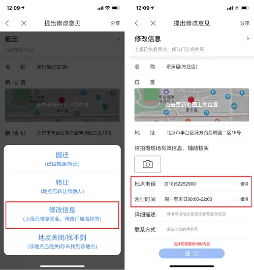 百度地图还鼓励用户积极上报信息,若用户发现身边商户的营业情况与现实不同,可以点击“上报-地点报错”,选择已复工的店铺并点击修改信息提交即可,此举也可帮助更多人了解实时、准确的商户营业情况。