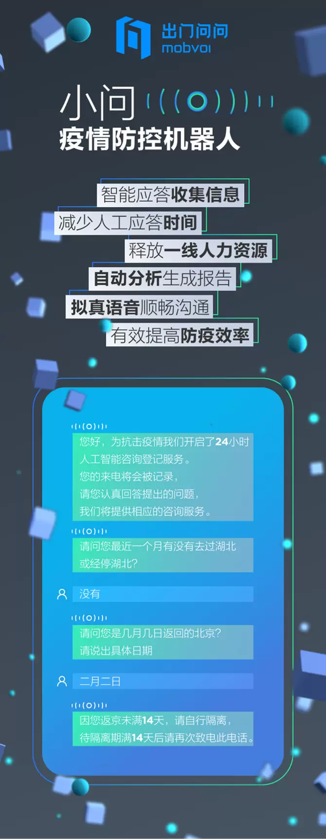 疫情爆发以来,出门问问密切关注形势动态,针对当前各级政府、社区面临大量电话呼入,且防疫人力不足的痛点,出门问问主动向辖区政府提出以AI技术提供面对呼入者的智能电调及信息咨询服务平台。获政府应援确认后,出门问问即刻内部立项,紧急调度北京、苏州等多地AI算法及产品的骨干力量联动支持,日夜开发,争分夺秒,“小问疫情防控机器人”以不到三天的时间迅捷上岗。