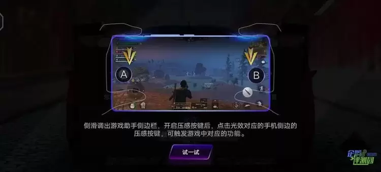 在外观部分提到的两枚侧边压感键,这个时候就可以派上用场了,在游戏过程中,从画面右上角可以轻划出「游戏助手」,然后可以对这两颗「压感按键」进行功能设置。我是将「AB按键」分别映射到「射击」和「打开倍镜」按钮,这样相当于压感键起到了「游戏手柄」中R和L键的功能,使得两根食指也可以加入到游戏操控中,同时使用四根手指去操作,一来减少一根手指负责多个按钮的操作不便,二来减少手指来回操控屏幕时对于画面的遮挡。