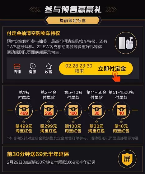 2月29日超级品牌日当天,预售用户付尾款除了可以赢取iQOO全系列手机大礼包,0点第1名付尾款的用户还能额外获赠499元淘宝红包、2~4名付尾款额外获赠299元淘宝红包、5~10名付尾款额外获赠100元淘宝红包、11~50名付尾款额外获赠30元淘宝红包、51~1500名付尾款额外获赠10元淘宝红包。