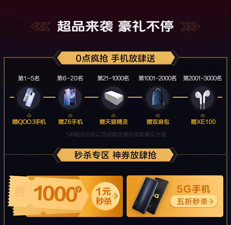 超级品牌日当天0点,全店第1~5名购机的用户获赠iQOO 3新品手机、6~20名获赠vivo Z6新品手机、21~1000名获赠天猫精灵、1001~2000名获赠vivo双肩包、2001~3000名获赠XE100耳机;在当天的13个整点购机的用户还有额外好礼赠送。